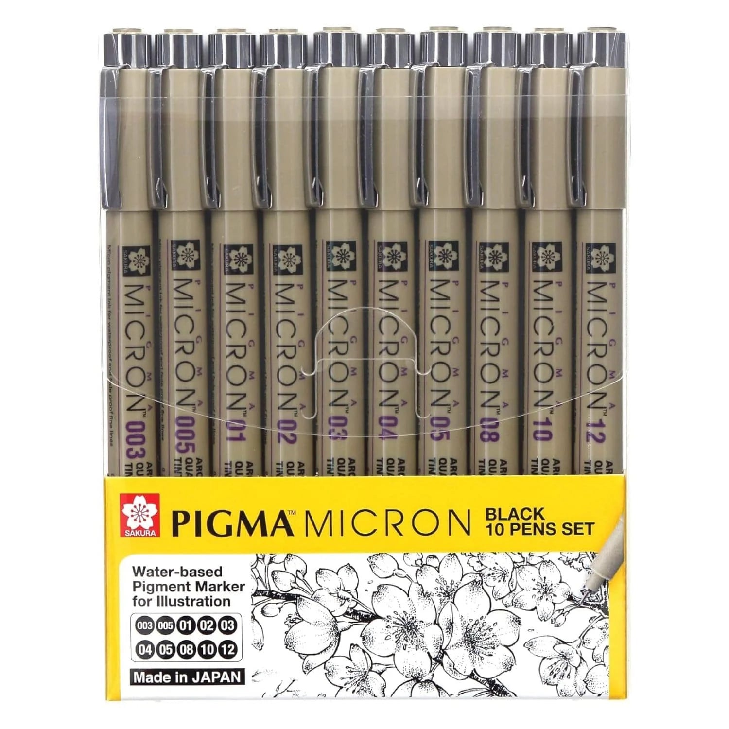 El set de 10 Tiralíneas Negros de Pigma Micron incluye los siguientes grosores de punta: 003, 005, 01, 02, 03, 04, 05, 08, 10 y 12.